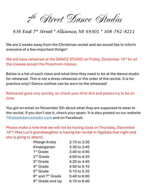 Classes begin the day after Labor Day and run to the end of April. We have a Christmas recital where the proceeds are donated to a different cause every year to help mostly non-profits in our area. We also have a spring recital towards the end of April.